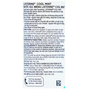 Nước súc miệng Listerine Cool Mint bảo vệ khoang miệng suốt 24h khỏi vi khuẩn hôi miệng, mảng bám, viêm mướu (100ml)