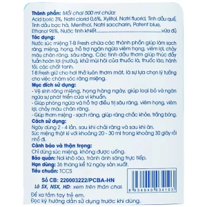 Nước súc miệng T-B Fresh 500ml Traphaco làm sạch răng, miệng, họng, hỗ trợ ngăn ngừa viêm họng, viêm lợi