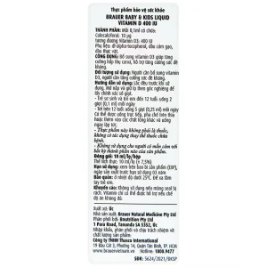Siro Brauer Baby Kids Liquid Vitamin D 400IU bổ sung vitamin D3, tăng cường hấp thụ canxi (10ml)