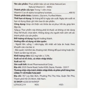 Viên uống Vitamin E 400IU Nature’s Bounty hỗ trợ chống oxy hóa, làm chậm quá trình lão hóa da (30 viên)