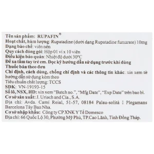 Thuốc Rupafin 10mg Hyphens điều trị viêm mũi dị ứng, nổi mày đay (1 vỉ x 10 viên)