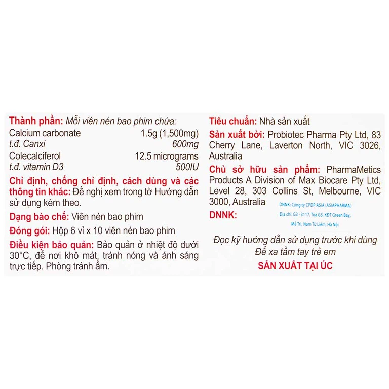 Triệu chứng quá liều: Ở liều rất cao, calcium carbonate có thể tăng canxi huyết, gây hội chứng sữa kiềm, suy/hư thận (triệu chứng: Khát nước, hay đi tiểu), vitamin D tăng canxi huyết , có thể gây thiếu máu.