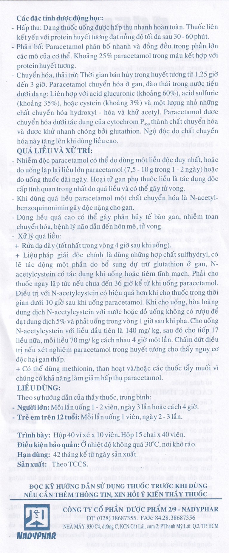 Thời gian bán hủy trong huyết tương từ 1,25 giờ đến 3 giờ. Paracetamol chuyển hóa ở gan, đào thải trong nước tiểu dưới dạng: Liên hợp với acid glucuronic (khoảng 60%), acid sulfuric (khoảng 35%), hoặc cystein (khoảng 3%) và một lượng nhỏ những chất chuyển hóa hydroxyl – hóa và khử acetyl. Paracetamol được chuyển hóa dưới tác dụng của cytochrom P450 thành chất chuyển hóa và được khử nhanh chóng bởi glutathion. Ngộ độc do chất chuyển hóa này tăng lên khi dùng liều cao.