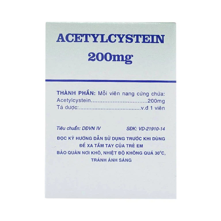 Acetylcystein 200 mg của công ty cổ phần dược phẩm trung ương Vidipha, thành phần chính là acetylcystein. Thuốc có tác dụng dùng làm tiêu nhầy trong bệnh nhầy nhớt, bệnh lý hô hấp có đờm nhầy quánh như trong viêm phế quản cấp và mạn tính, làm sạch thường quy trong mở khí quản. Acetylcystein 200 mg được bào chế dạng viên nang cứng, đóng gói theo quy cách hộp 20 vỉ x 10 viên.