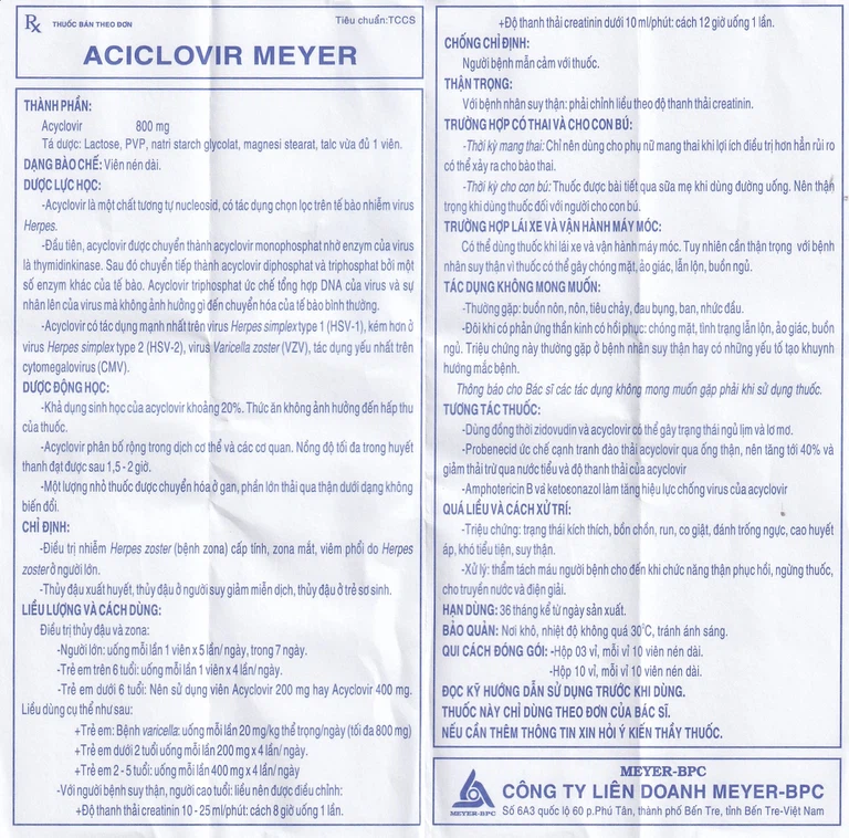 Phân bố:Acyclovir phân bố rộng trong dịch cơ thể và các cơ quan. Nồng độ tối đa trong huyết thanh đạt được sau 1,5 – 2 giờ.