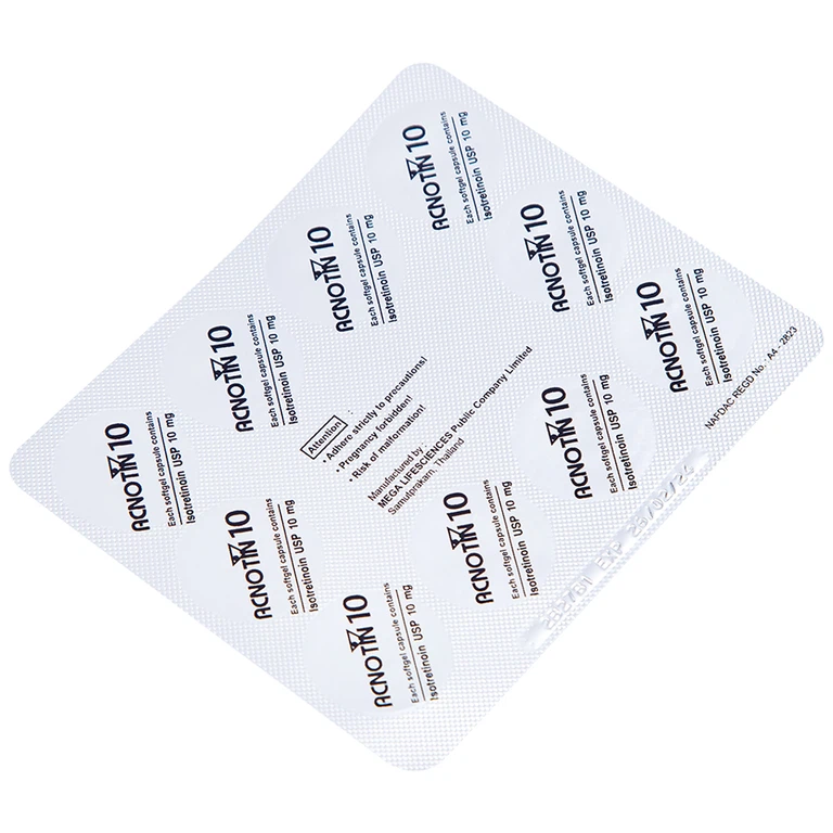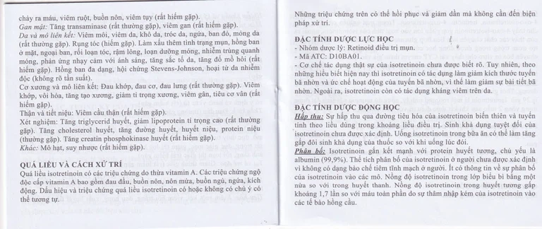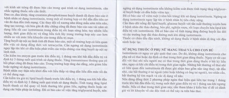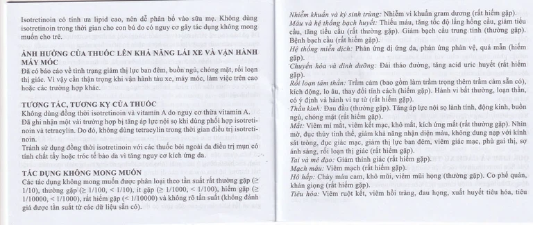 - Cơ xương khớp và da: Viêm môi, viêm da, khô da, phát hồng ban, da nhạy cảm với ánh sáng; đau khớp, đau cơ, đau lưng (đặc biệt ở trẻ em và bệnh nhân vị thành niên); đau đầu.