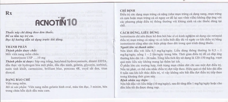 Thuốc Acnotin được chỉ định dùng điều trị mụn trứng cá nặng (như mụn trứng cá dạng nang, mụn trứng cá cụm hoặc mụn trứng cá có nguy cơ để lại sẹo vĩnh viễn) không đáp ứng với các phương pháp điều trị thông thường với kháng sinh và các thuốc dùng tại chỗ.