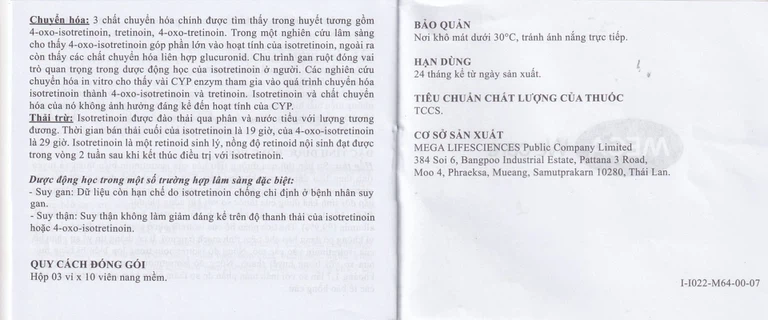 Isotretinoin được chuyển hóa ở gan và có thể ở cả thành ruột non. Chất chuyển hóa chính được tìm thấy trong máu và nước tiểu dưới dạng 4 – oxo – isotretinoin. Ngoài ra còn có các chất khác như isotretinoin và 4 – oxo – isotretinoin.