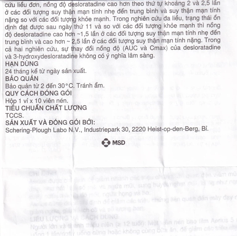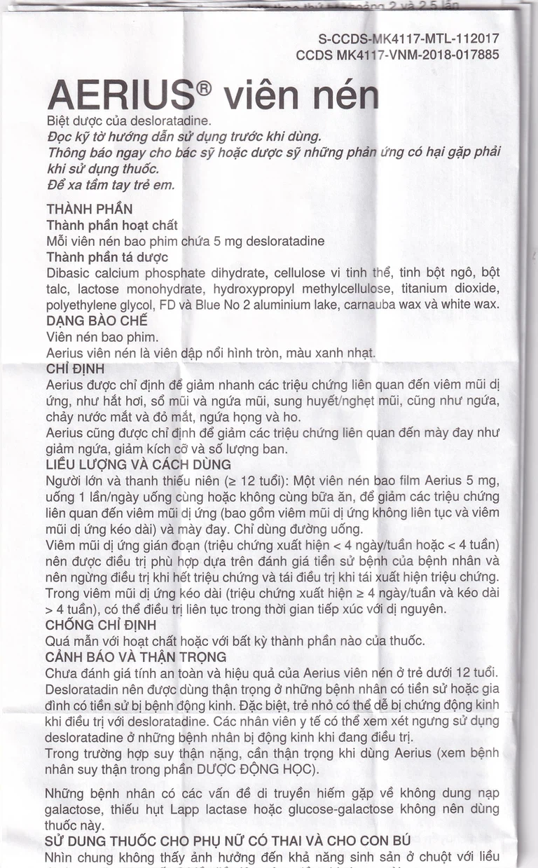 - Một viên nén bao film Aerius 5mg hoặc 10mL (5mg) Aerius siro, uống 1 lần/ngày để giảm các triệu chứng liên quan đến viêm mũi dị ứng (bao gồm viêm mũi dị ứng không liên tục và viêm mũi dị ứng kéo dài) và mày đay.