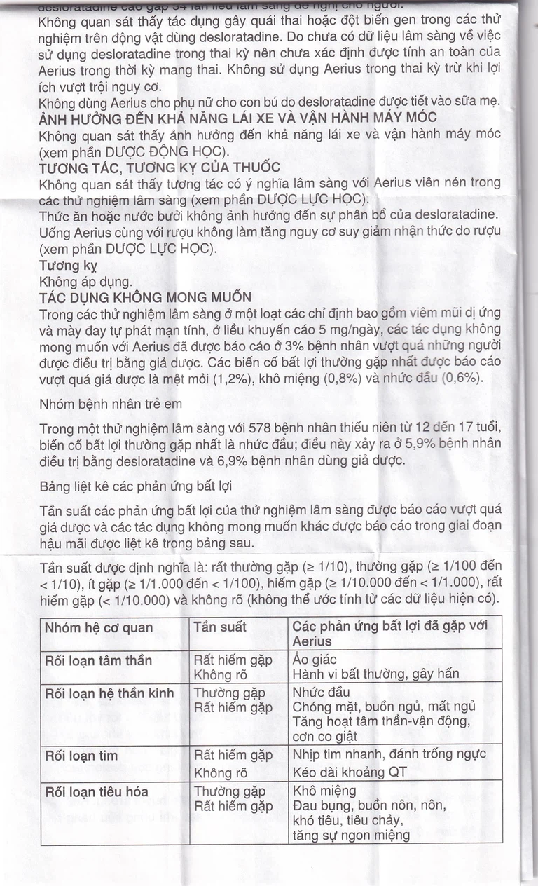 Trong những thử nghiệm lâm sàng với các chỉ định về viêm mũi dị ứng và mày đay tự phát mạn tính, với liều đề nghị 5mg/ngày, những tác dụng ngoại ý do Aerius viên nén được báo cáo ở 3% bệnh nhân và cao hơn so với bệnh nhân dùng placebo.