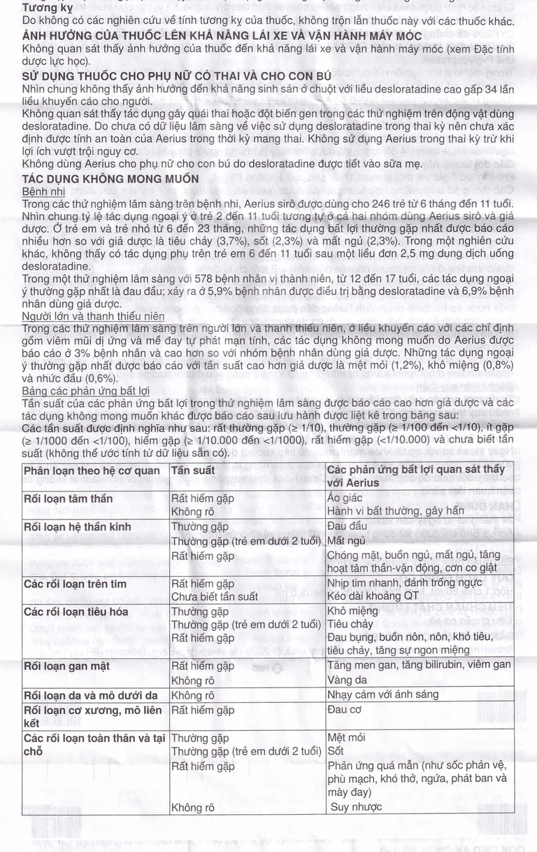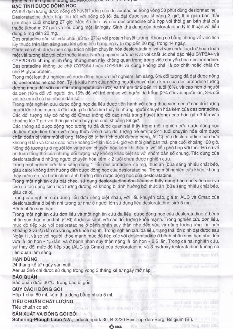 Thuốc Aerius 0.5mg/ml của Công ty Schering (Bỉ), thuốc có thành phần chính là Desloratadine. Đây là một thuốc thuộc nhóm kháng histamin và kháng dị ứng. Thuốc dị ứng Aerius 0.5mg/ml được chỉ định để giảm nhanh các triệu chứng đến viêm mũi dị ứng như hắt hơi, sổ mũi, ngứa mũi, sung huyết, nghẹt mũi hay ngứa, chảy nước mắt, đỏ mắt, ngứa họng và ho. Thuốc này cũng được dùng để giảm triệu chứng mề đay như giảm ngứa, giảm kích thước và số lượng phát ban. Một số tác dụng khác của thuốc không được liệt kê trên nhãn thuốc đã được phê duyệt nhưng bác sĩ có thể chỉ định bạn dùng. Bạn chỉ sử dụng thuốc này để điều trị một số bệnh lý chỉ khi có chỉ định của bác sĩ.