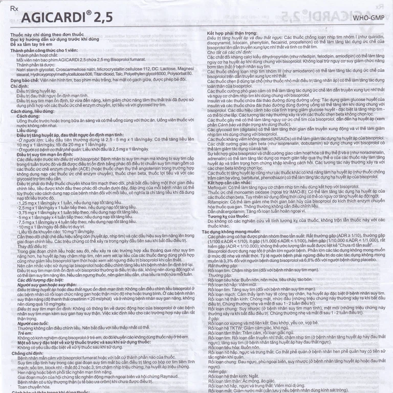 Thuốc Agicardi 2,5 là sản phẩm của Công ty Cổ phần Dược phẩm Agimexpharm dạng viên nén bao phim chứa hoạt chất Bisoprolol fumarat dùng trong điều trị tăng huyết áp, đau thắt ngực ổn định mạn tính, suy tim mạn ổn định, từ vừa đến nặng, kèm giảm chức năng tâm thu thất trái đã được sử dụng phối hợp với các thuốc ức chế enzym chuyển, lợi tiểu và với glycosid trợ tim.