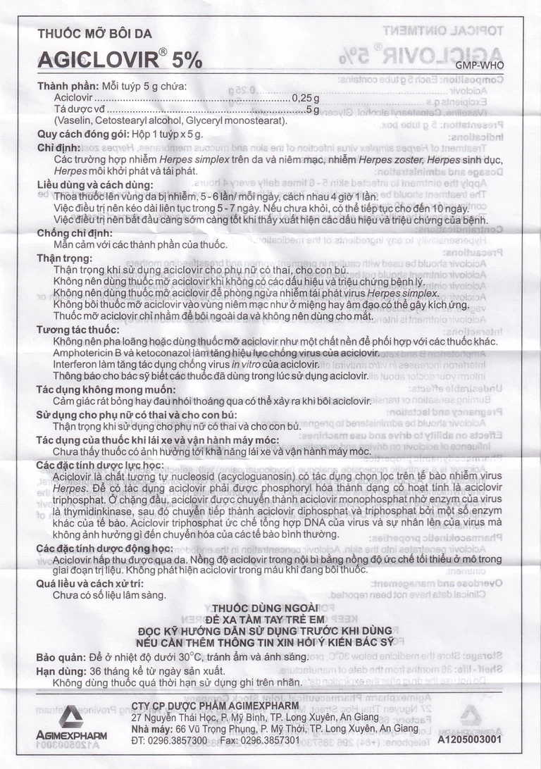 Thành phần của Thuốc mỡ bôi da Agiclovir 5%
