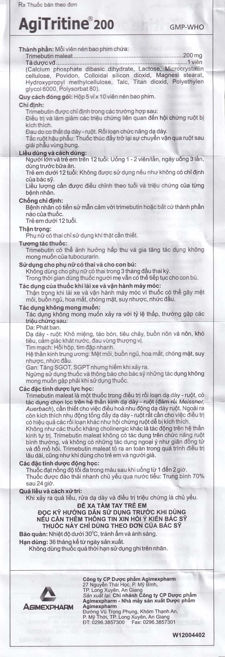 Agitritine 200 được sản xuất bởi Công ty Cổ phần Dược phẩm Agimexpharm, với thành phần chính Trimebutine maleate, là thuốc dùng để điều trị và làm giảm các triệu chứng liên quan đến hội chứng ruột kích thích, đau do co thắt dạ dày–ruột, rối loạn chức năng dạ dày. Thuốc còn được dùng để thúc đẩy trở lại sự chuyển vận qua ruột sau giải phẫu vùng bụng.
