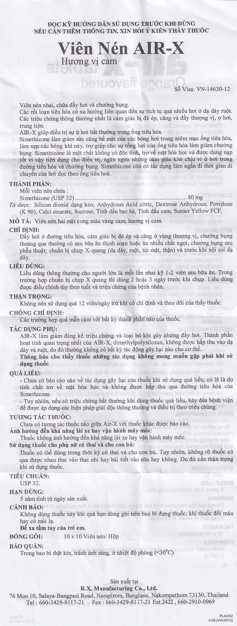 AIR-X làm giảm đáng kể triệu chứng và loại bỏ khí gây chứng đầy hơi. Thành phần hoạt tính quan trọng nhất của AIR-X, dimethylpolysiloxan, không được hấp thu vào dạ dày và ruột, do đó thường không có bất kỳ tác động gây hại nào cho cơ thể.