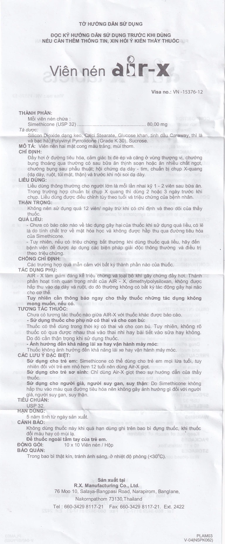 AIR-X làm giảm đáng kể triệu chứng và loại bỏ khí gây chứng đầy hơi. Thành phần hoạt tính quan trọng nhất của AIR-X, dimethylpolysiloxan, không được hấp thu vào dạ dày và ruột, do đó thường không có bất kỳ tác động gây hại nào cho cơ thể.