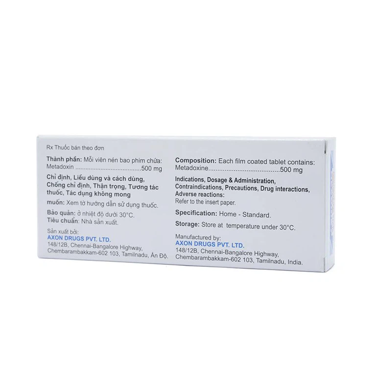 Alcomet của Công ty Axon Drugs Pvt. Ltd., thành phần chính là metadoxin. Alcomet là thuốc điều trị nhiễm độc rượu cấp tính, gan nhiễm mỡ do rượu và hỗ trợ điều trị các bệnh gan cấp và mãn tính. Alcomet được bào chế dạng viên nén bao phim, đóng gói theo quy cách hộp 3 vỉ x 10 viên nén.