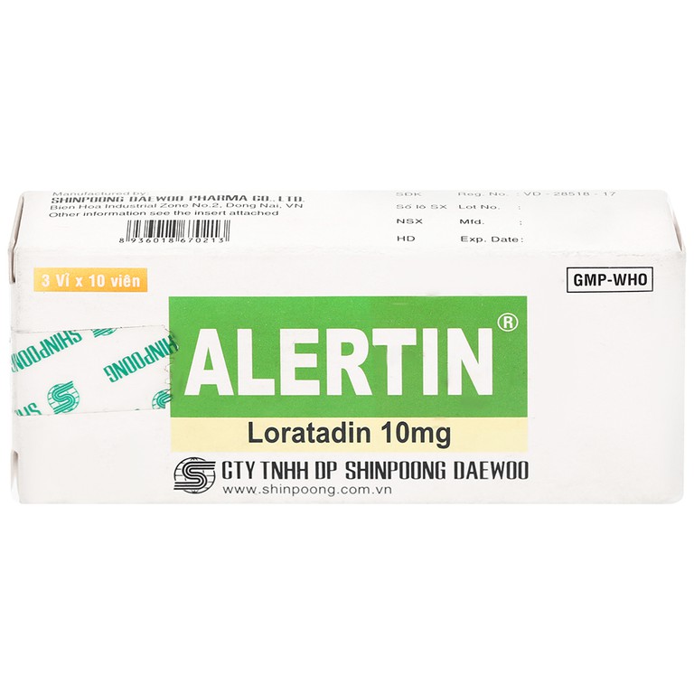 Alertin là sản phẩm của Công ty Dược Phẩm ShinPoong Daewoo Việt Nam với thành phần chính là Loratadin. Thuốc Alertin được chỉ định trong trường hợp viêm mũi dị ứng, viêm kết mạc dị ứng, mề đay và các rối loạn dị ứng da.