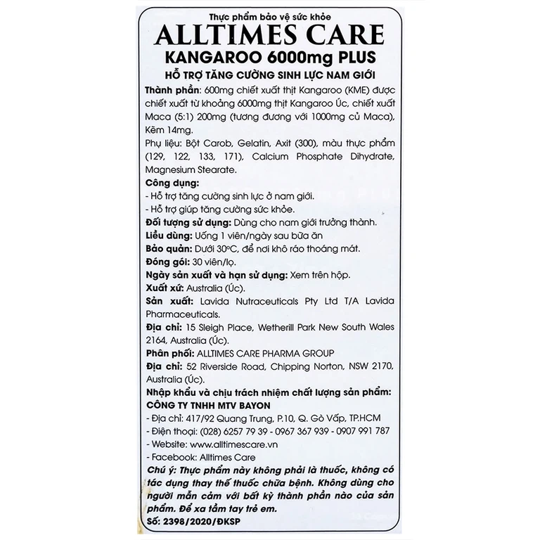 Alltimes Care Kangaroo Plusvới chiết xuất từ 6000mg thịt Kangaroo, bổ sung thêm maca và kẽm giúp tăng cường sinh lực phái mạnh, để nam giới luôn ở đỉnh cao phong độ. Sản phẩm xuất xứ từ Australia.