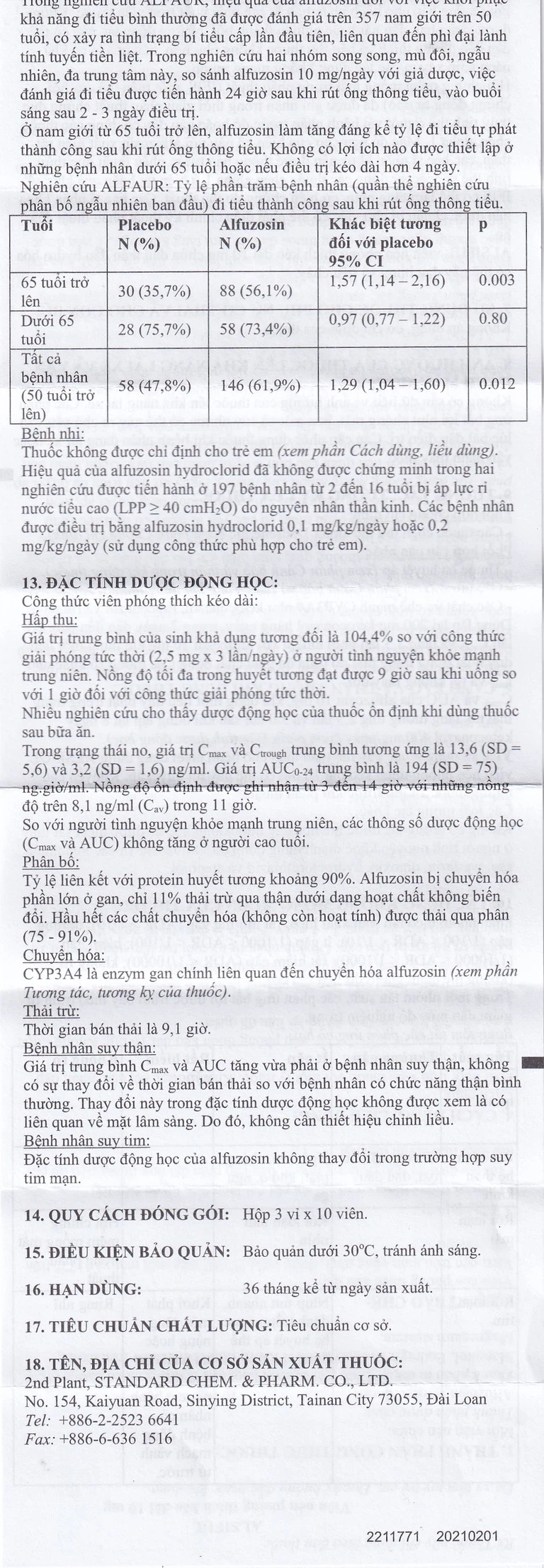 Alfuzosin là một dẫn xuất quinazoline có hoạt tính, dùng đường uống. Có tác dụng chọn lọc trên các thụ thể alpha – 1 ngoại biên tại tuyến tiền liệt, bàng quang và niệu đạo.