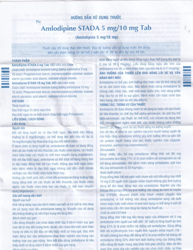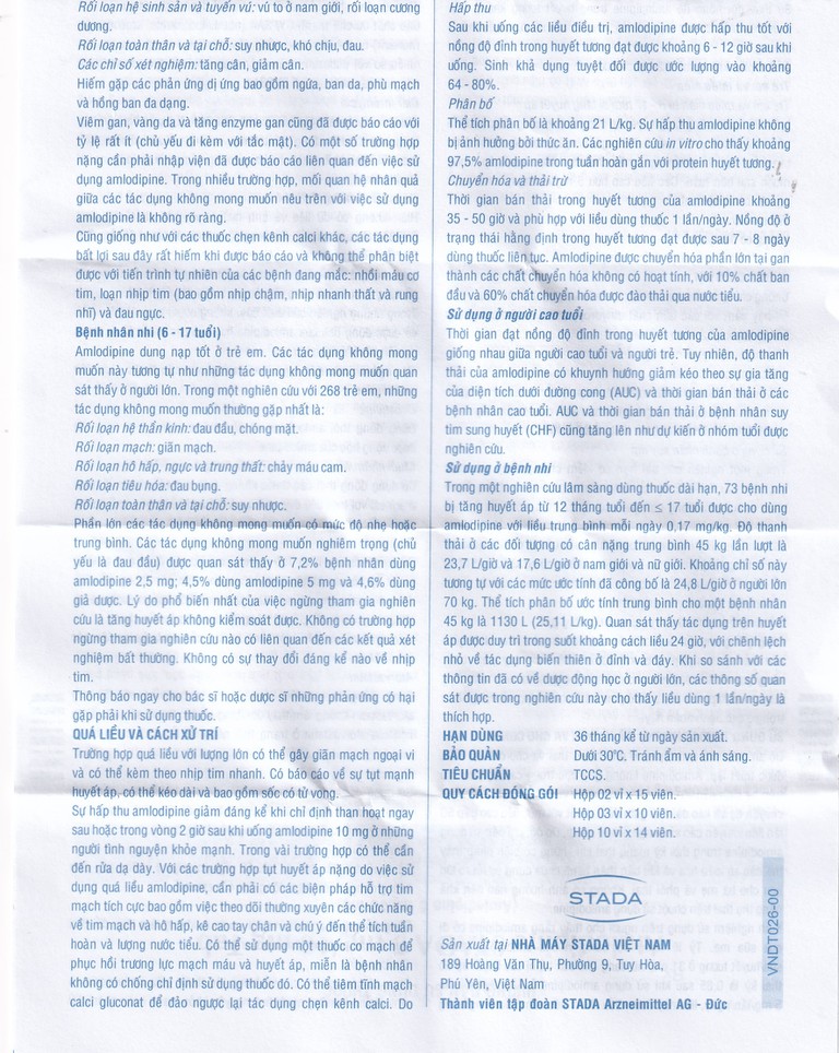 Amlodipin Stada 5mg được sản xuất bởi Công ty TNHH LD Stada – Việt Nam chứa thành phần chính là Amlodipin. Thuốc được chỉ định để điều trị tăng huyết áp, đau thắt ngực ổn định mạn tính, đau thắt ngực do co thắt mạch (Đau thắt ngực Prinzmetal). Amlodipin Stada 5mg được bào chế dưới dạng Viên nén tròn, màu trắng, hai mặt khum, một mặt trơn, một mặt có khắc vạch. Hộp 10 vỉ x 14 viên nén. Mỗi viên chứa 5mg amlodipin.