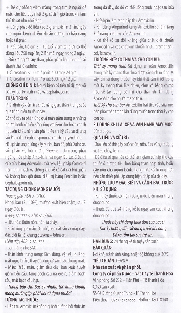 Để dự phòng viêm màng trong tim ở người dễ mắc, cho liều duy nhất 3g, cách 1 qiờ trước khi làm thủ thuật như nhổ răng.
