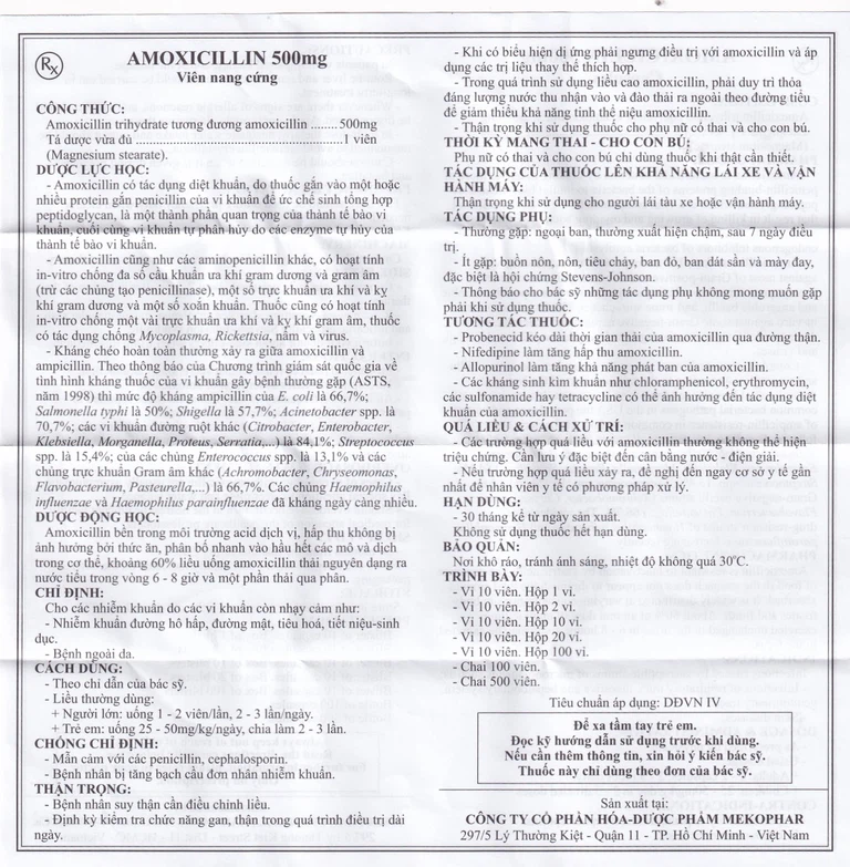 Amoxicillin cũng như các aminopenicillin khác, có hoạt tính in-vitro chống đa số cầu khuẩn hiếu khí gram dương và gram âm (trừ các chủng tạo penicillinase), một số trực khuẩn hiếu khí và kỵ khí gram dương, một số xoắn khuẩn. Thuốc cũng có hoạt tínhin-vitro chống một vài trực khuẩn hiếu khí và kỵ khí gram âm, thuốc có tác dụng chốngMycoplasma, Rickettsia, nấm và virus.