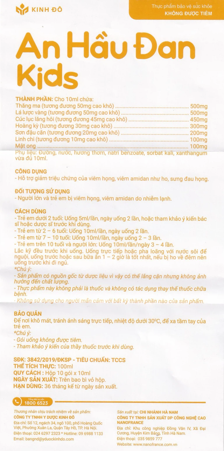 Thực phẩm bảo vệ sức khoẻ An Hầu Đan Kids Kinh Đô hỗ trợ giảm triệu chứng của viêm họng (10 gói x 10ml)