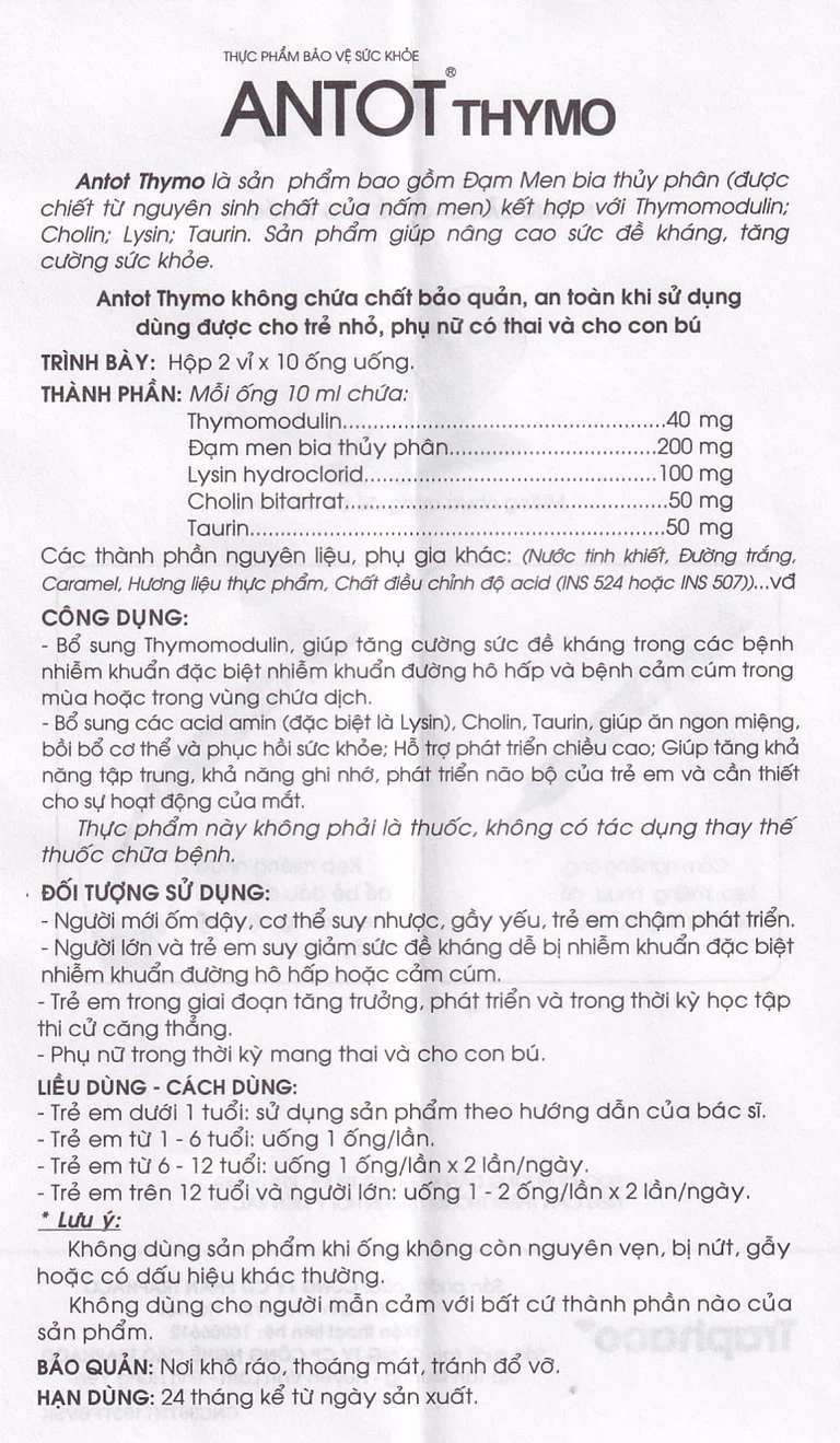 Antot Thymo giúp bổ sung thymomodulin, giúp tăng cường sức đề kháng trong các bệnh nhiễm khuẩn, đặc biệt nhiễm khuẩn đường hô hấp và bệnh cảm cúm trong mùa hoặc trong vùng chứa dịch. Bổ sung các acid amin (đặc biệt là lysin), cholin, taurin, giúp ăn ngon miệng, bồi bổ cơ thể và phục hồi sức khỏe; Hỗ trợ phát triển chiều cao; Giúp tăng khả năng tập trung, khả năng ghi nhớ, phát triển não bộ của trẻ em và cần thiết cho sự hoạt động của mắt.