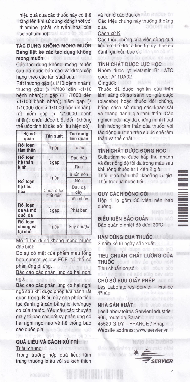 Sulbutiamine được hấp thu nhanh chóng và dạt nồng dộ tối đa trong máu sau khi uống thuốc từ 1 đến 2 giờ Thời gian bán thải khoảng 5 giờ. Thải trừ qua nước tiểu.