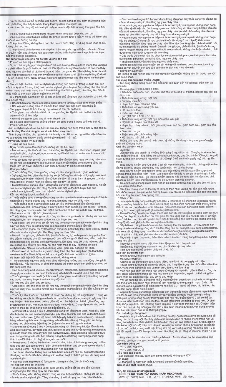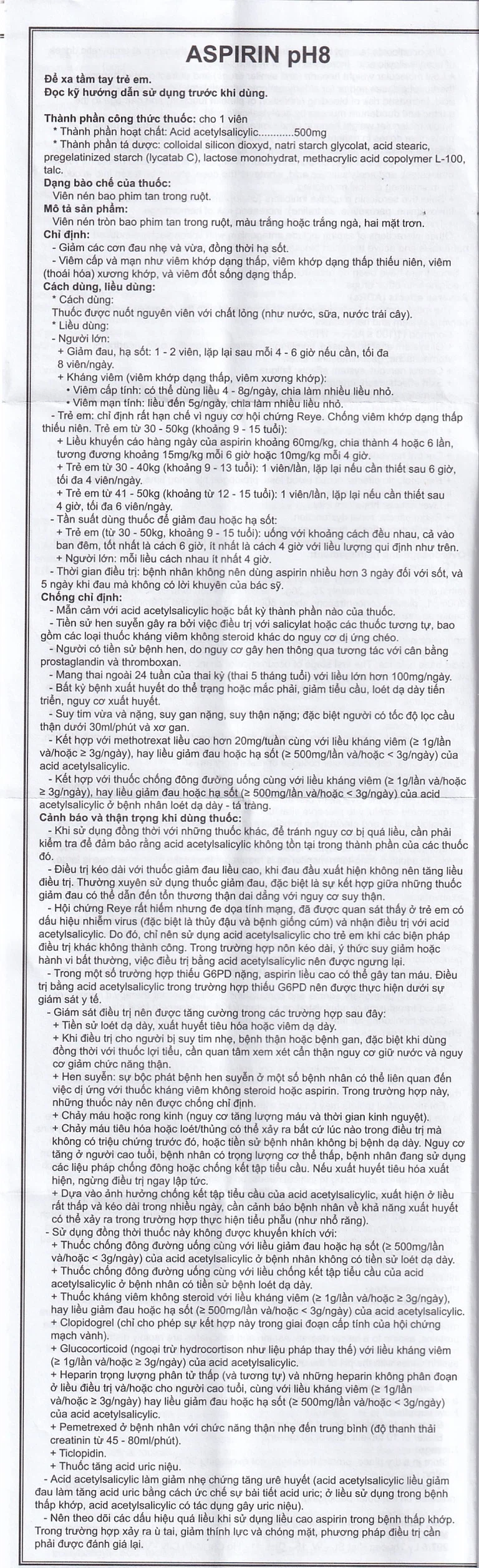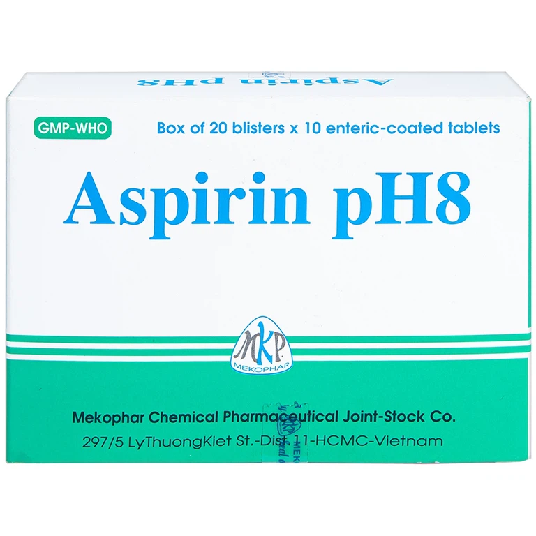 Thuốc Aspirin pH8 là một sản phẩm của Công ty cổ phần hóa dược phẩm MEKOPHAR, chứa hoạt chất chính là acid acetylsalicylic với hàm lượng 500 mg. Thuốc dùng để điều trị các cơn đau nhẹ và vừa, giảm đau, hạ sốt; điều trị viêm cấp và mạn như viêm khớp dạng thấp, viêm khớp dạng thấp thiếu niên, viêm (thoái hóa) xương khớp và viêm đốt sống dạng thấp Aspirin pH8 được bào chế dạng viên nén tròn bao phim tan trong ruột, màu trắng hoặc trắng ngà, hai mặt trơn và đóng gói theo quy cách: Hộp 5 vỉ x 10 viên và hộp 20 vỉ x 10 viên.