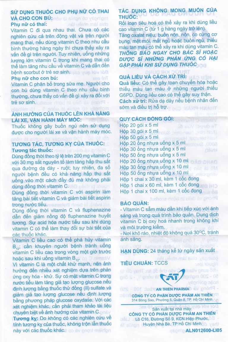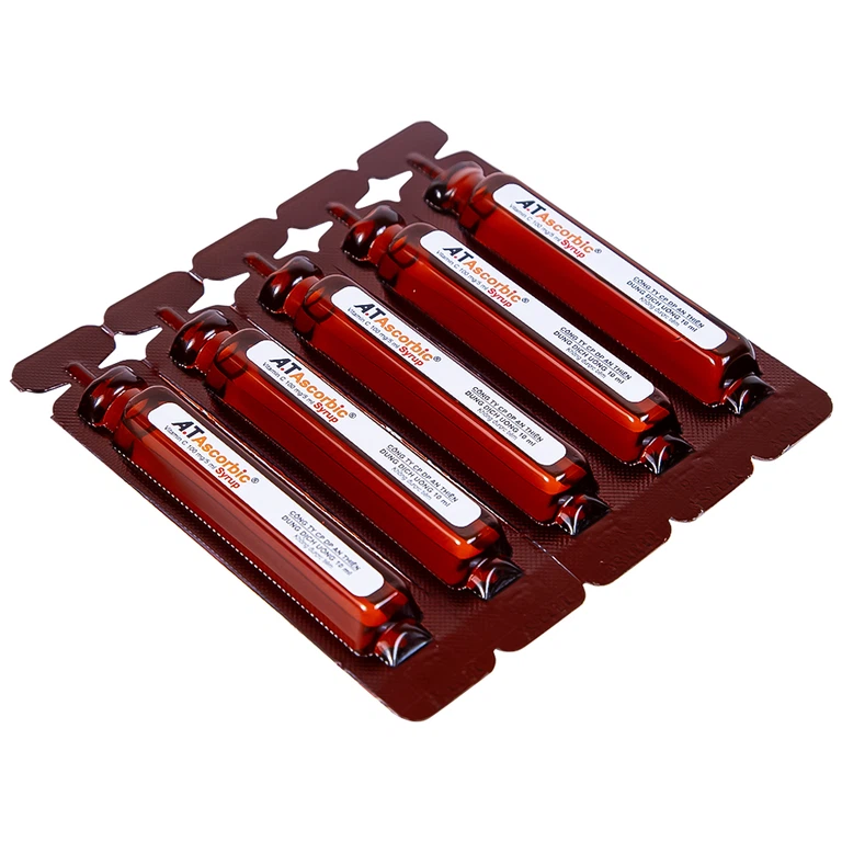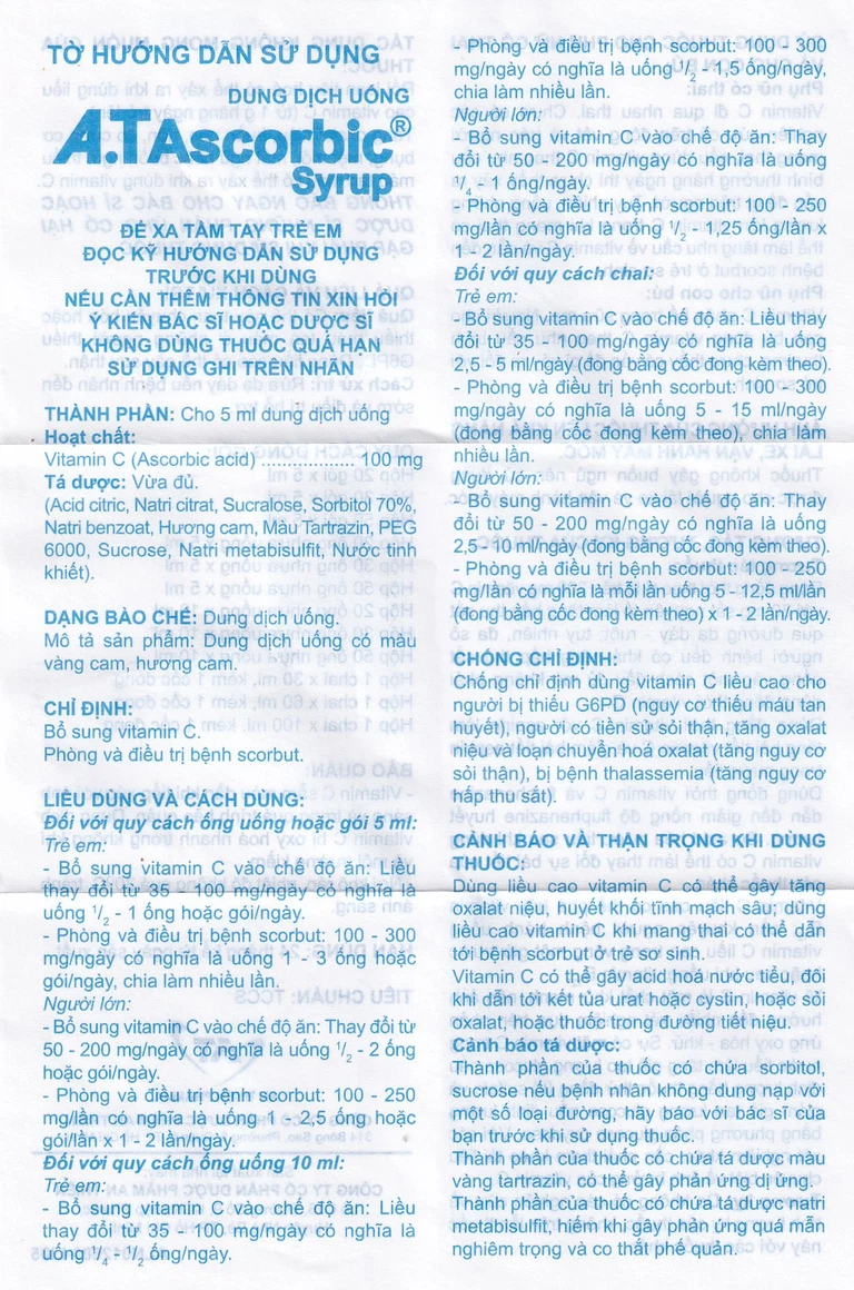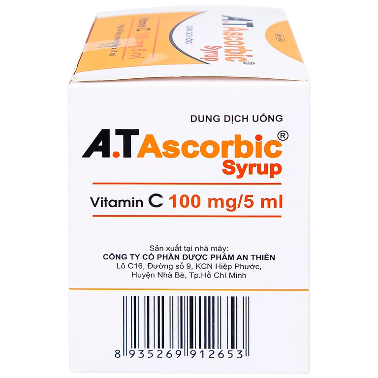 A.T Ascorbic syrup An Thiên 30 ống x 10ml – dung dịch uống của công ty cổ phần dược phẩm An Thiên, thành phần chính chứa vitamin C (ascorbic acid), là thuốc dùng để bổ sung vitamin C; phòng và điều trị bệnh scorbut. A.T Ascorbic syrup An Thiên 30 ống x 10ml – dung dịch uống được bào chế dưới dạng dung dịch uống có màu vàng cam, hương cam; hộp 20 ống, hộp 30 ống, hộp 50 ống nhựa x 10 ml (đóng ống từ màng PVC/PE).