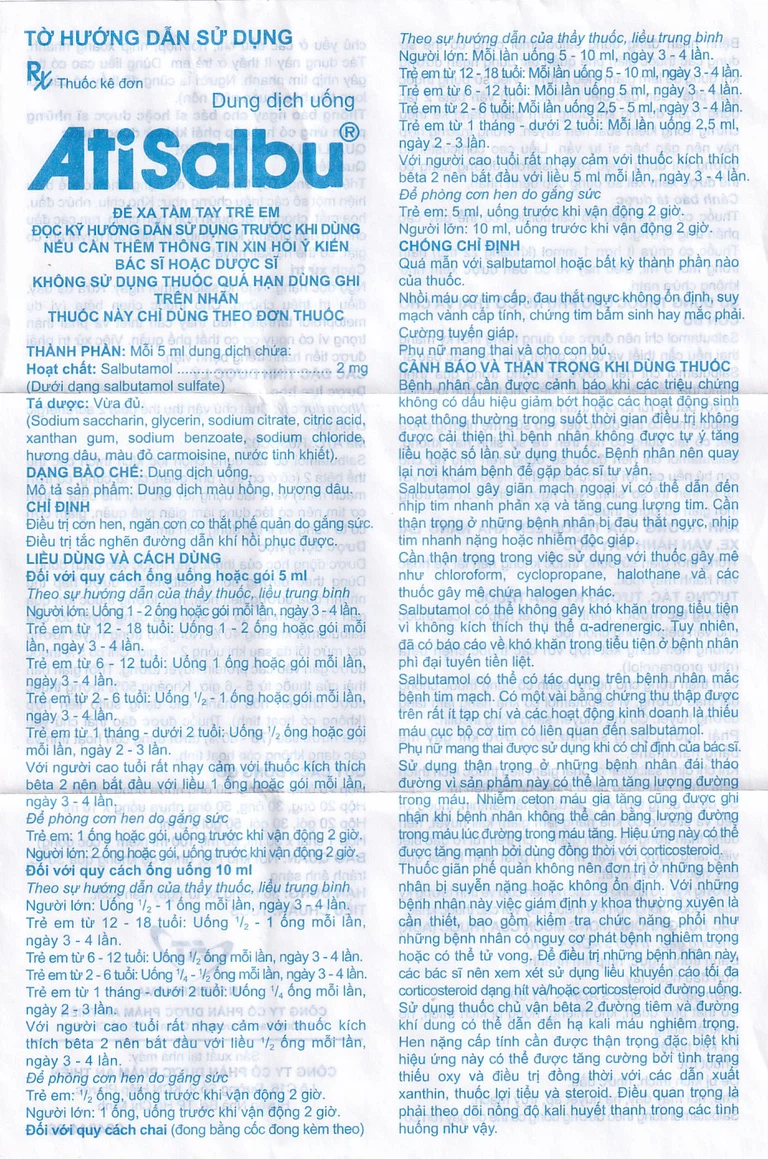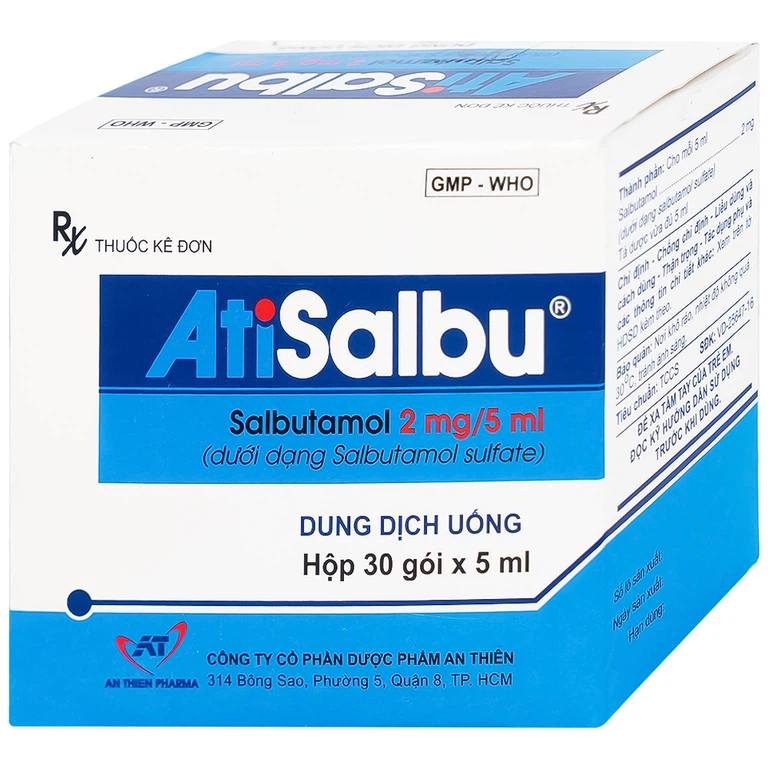 Thuốc Atisalbu là sản phẩm của Công ty Cổ phần Dược phẩm An Thiên, thành phần chính chứa Salbutamol, là thuốc dùng trong co thắt phế quản do hen phế quản, viêm phế quản mãn và các bệnh phế quản – phổi mãn tính khác.