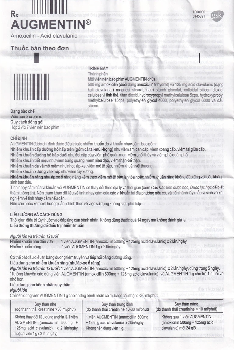 Suy thận trung bình (Creatinin 10 – 30 ml/phút): 625 mg x 2 lần/ngày. Không nên dùng viên 1g.