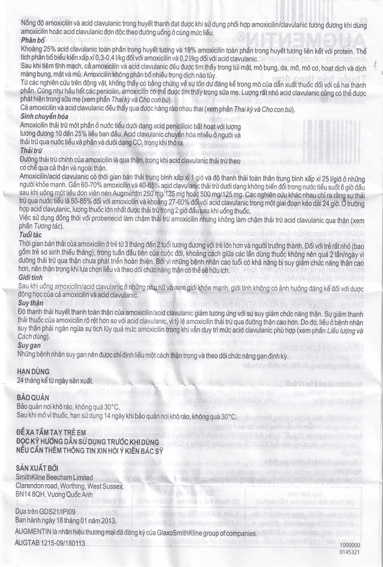 Amoxicillin thải trừ qua nước tiểu dưới dạng acid penicilloic bất hoạt (lượng tương đương 10 – 25% liều ban đầu). Acid clavulanic chuyển hóa nhiều ở người, thải qua nước tiểu và phân dưới dạng CO2 trong khí thở ra.