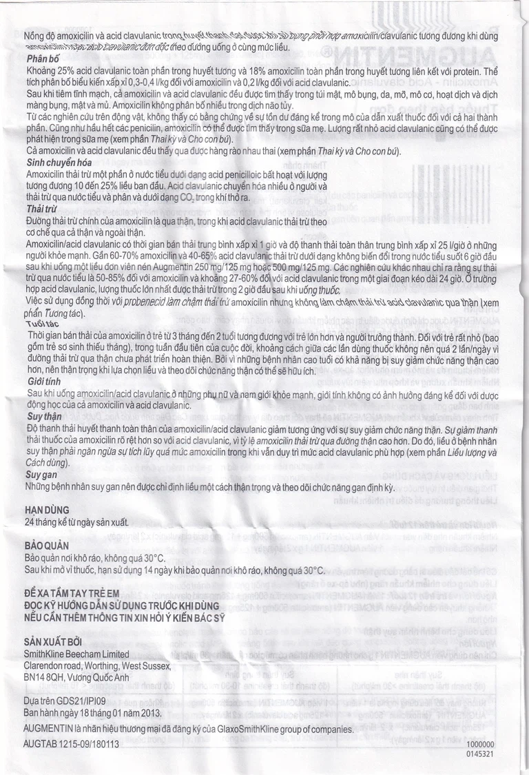 Khoảng 25% acid clavulanic và 18% amoxicillin toàn phần trong huyết tương liên kết với protein. Thể tích phân bố biểu kiến của amoxicillin khoảng 0,3 – 0,4 L/kg và acid clavulanic khoảng 0,2 L/kg.
