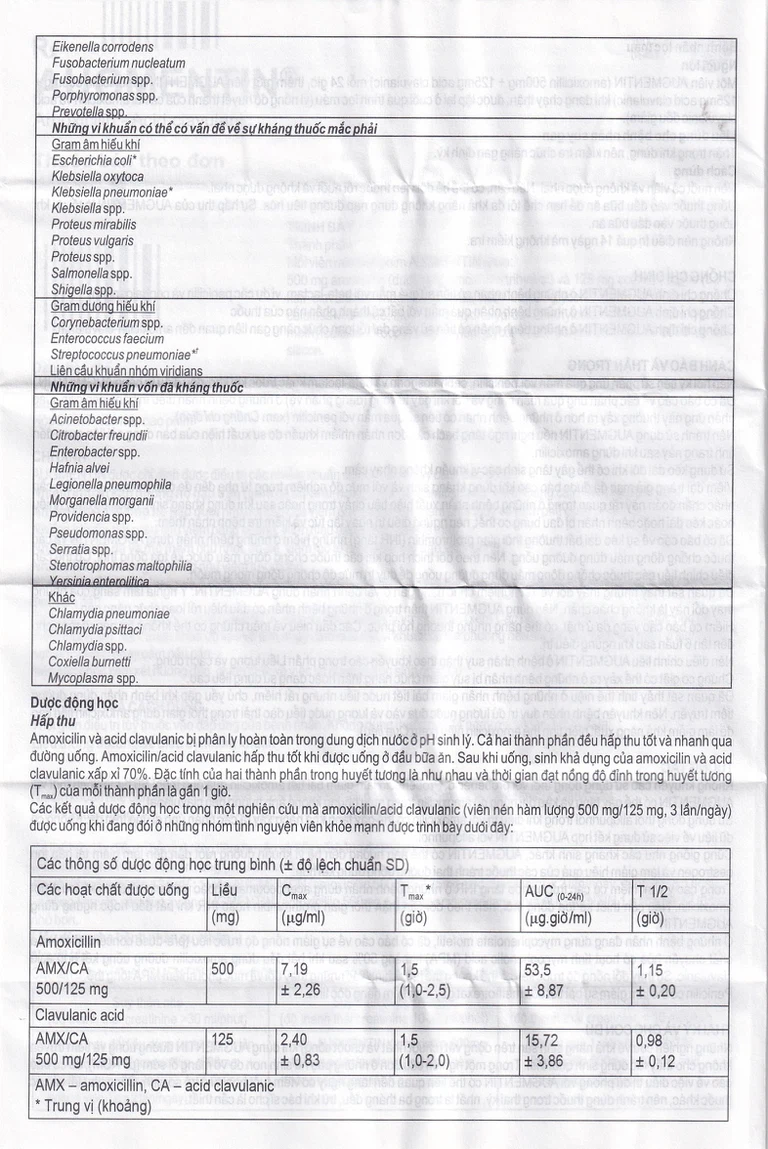 Amoxicillin và acid clavulanic phân ly hoàn toàn trong dung dịch nước ở pH sinh lý. Cả 2 đều hấp thu tốt và nhanh qua đường uống. Sinh khả dụng của amoxicillin và acid clavulanic sau uống khoảng 70%. Đặc tính của 2 hoạt chất trong huyết tương là như nhau và thời gian đạt nồng độ đỉnh của mỗi hoạt chất là gần 1 giờ.