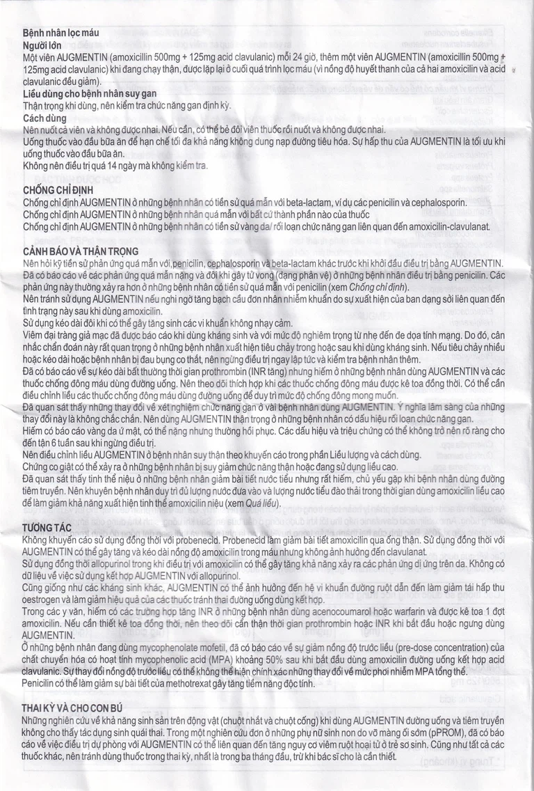 Ở bệnh nhân đang dùng mycophenolate mofetil, có thể có sự giảm nồng độ trước liều (pre – dose concentration) của chất chuyển hóa có hoạt tính mycophenolic acid (MPA) khoảng 50% sau khi bắt đầu dùng Augmentin. Sự thay đổi nồng độ trước liều có thể không thể hiện chính xác mức phơi nhiễm MPA tổng thể.