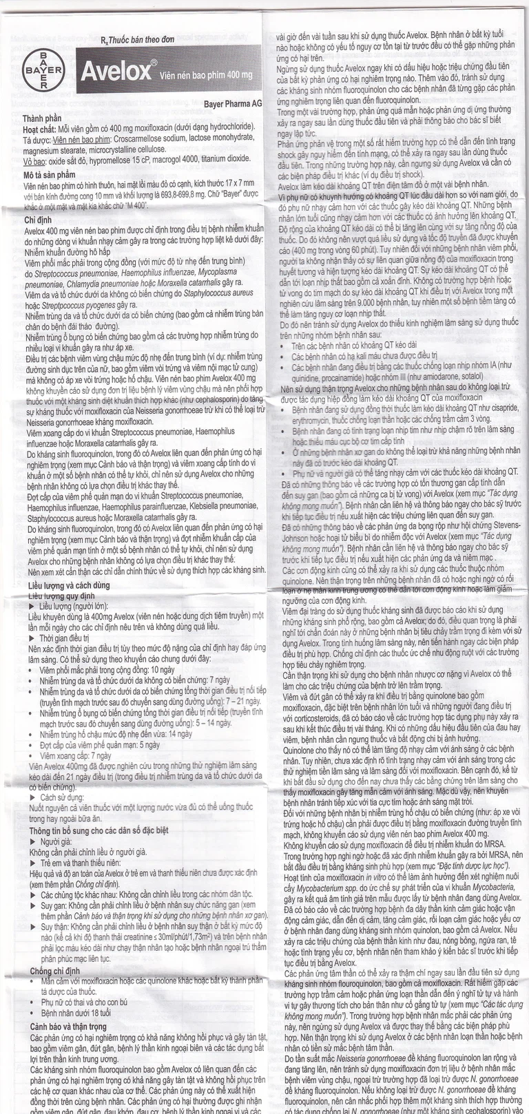 - Do kháng sinh fluoroquinolon, trong đó có Avelox liên quan đến phản ứng có hại nghiêm trọng (xem mục Cảnh báo và thận trọng) và viêm xoang cấp tính do vi khuẩn ở một số bệnh nhân có thể tự khỏi, chỉ nên sử dụng Avelox cho những bệnh nhân không có lựa chọn điều trị khác thay thế.