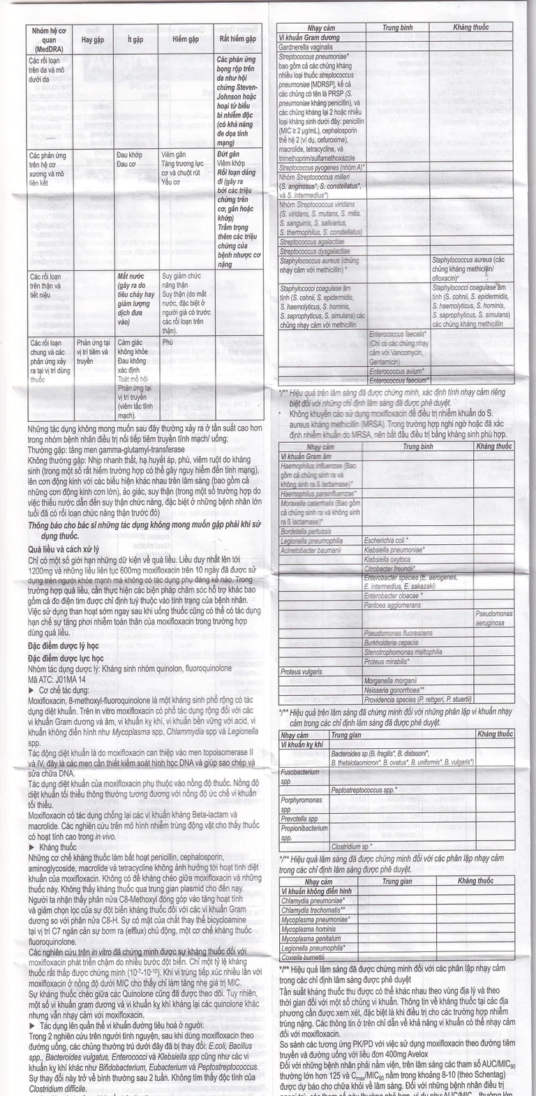 Các tác dụng ngoại ý (ADR) dựa trên các nghiên cứu lâm sàng với moxifloxacin 400mg (chỉ dùng uống và nối tiếp [IV/uống]/tiêm tĩnh mạch) sắp xếp theo CIOMS về các loại thường gặp (tổng quát n = 17.951 trường hợp trong đó có 4.583 trường hợp dùng nghiên cứu trị liệu nối tiếp hoặc tiêm tĩnh mạch, tại thời điểm tháng 5/2010) được liệt kê như sau: Các tác dụng không mong muốn ở mức “thường gặp” được quan sát với tần suất < 3% không kể triệu chứng nôn và tiêu chảy.