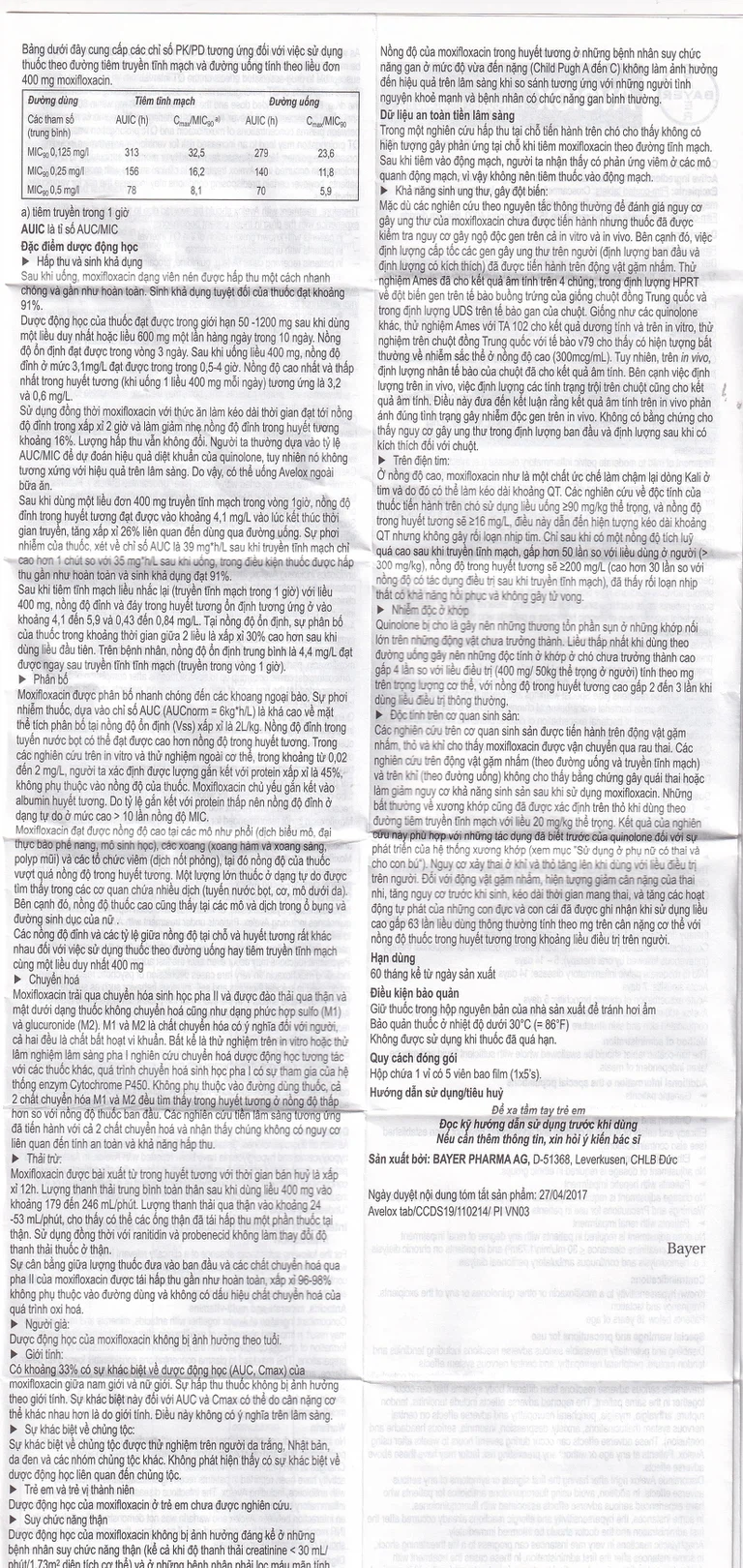 Viên Avelox 400mg đã được nghiên cứu trong những thử nghiệm lâm sàng kéo dài đến 21 ngày điều trị (trong điều trị nhiễm trùng da và tổ chức dưới da có biến chứng).