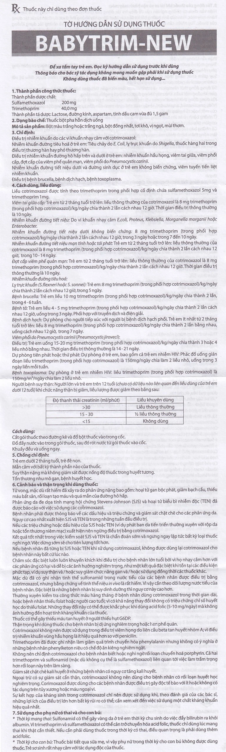 Trẻ em từ 2 tháng tuổi trở lên: Liều thông thường của cotrimoxazol là 8 mg trimethoprim (trong phối hợp cotrimoxazol)/kg/ngày chia thành 2 lần cách nhau 12 giờ. Thời gian điều trị thông thường là 10 ngày.