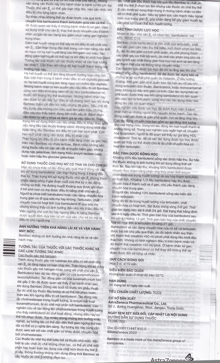 Rửa dạ dày, than hoạt tính. Đánh giá cân bằng kiềm toan, đường huyết và điện giải. Theo dõi tần số, nhịp tim và huyết áp. Chất giải độc thích hợp khi quá liều Bambec là chất ức chế thụ thể beta chọn lọc tim nhưng các thuốc ức chế thụ thể beta cần được sử dụng thận trọng ở những bệnh nhân có tiền sử co thắt phế quản. Nếu sự giảm sức cản mạch máu ngoại biên qua trung gian beta-2 góp phần đáng kể gây giảm huyết áp, cần phải bồi hoàn thể tích huyết tương.