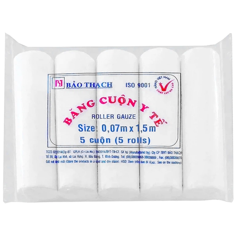 Băng cuộn Bảo Thạch (nhỏ) 0.07 x 1.5m 5 cuộn được dùng để băng bó vết thương ở đầu, tay, chân,… Băng cuộn được sử dụng ở hầu hết các bệnh viện, phòng khám, trung tâm y tế.