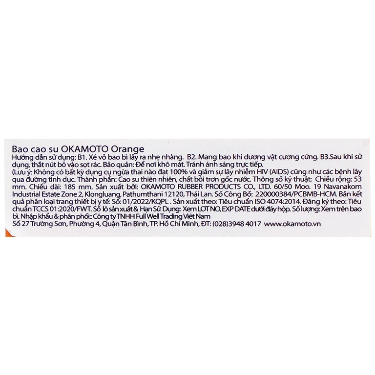 Bao cao su Okamoto Skinless Skin Orange có kích thước phù hợp với phần lớn nam giới Việt Nam. Thông số kỹ thuật cụ thể: