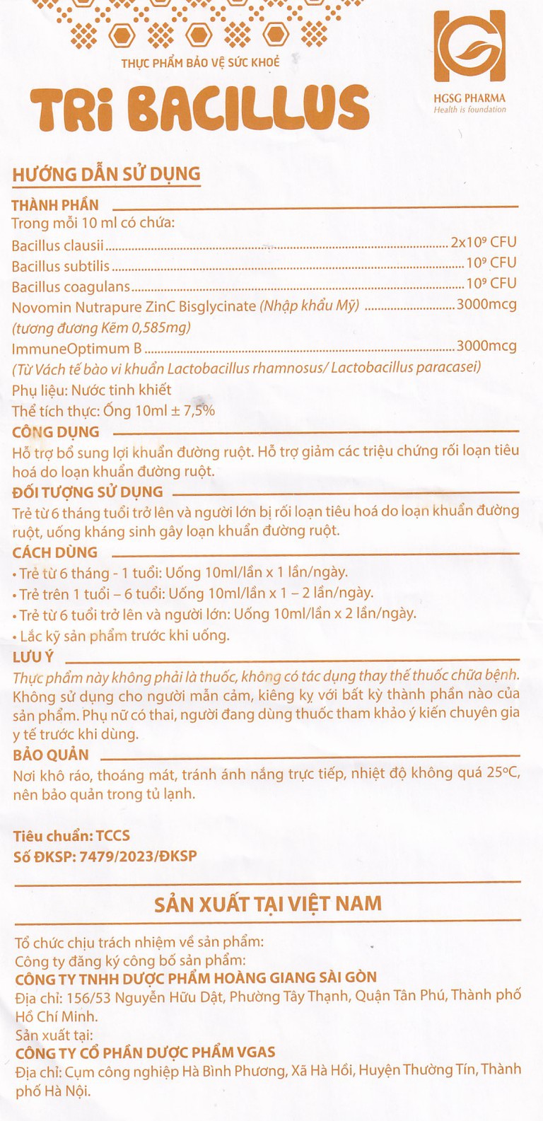 Thực phẩm bảo vệ sức khỏe Probiotics Tribacilus HGSG Pharma hỗ trợ bổ sung lợi khuẩn đường ruột (20 ống x 10ml)