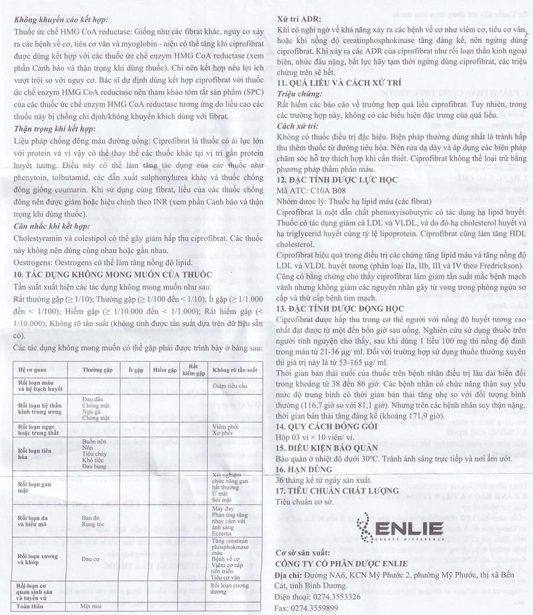 Giống như các fibrat khác, nguy cơ tiêu cơ vân và myoglobin – niệu có thể tăng khi ciprofibrat được dùng kết hợp với các fibrat khác hoặc thuốc ức chế enzym HMG CoA reductase (xem phần Chống chỉ định và tương tác thuốc).