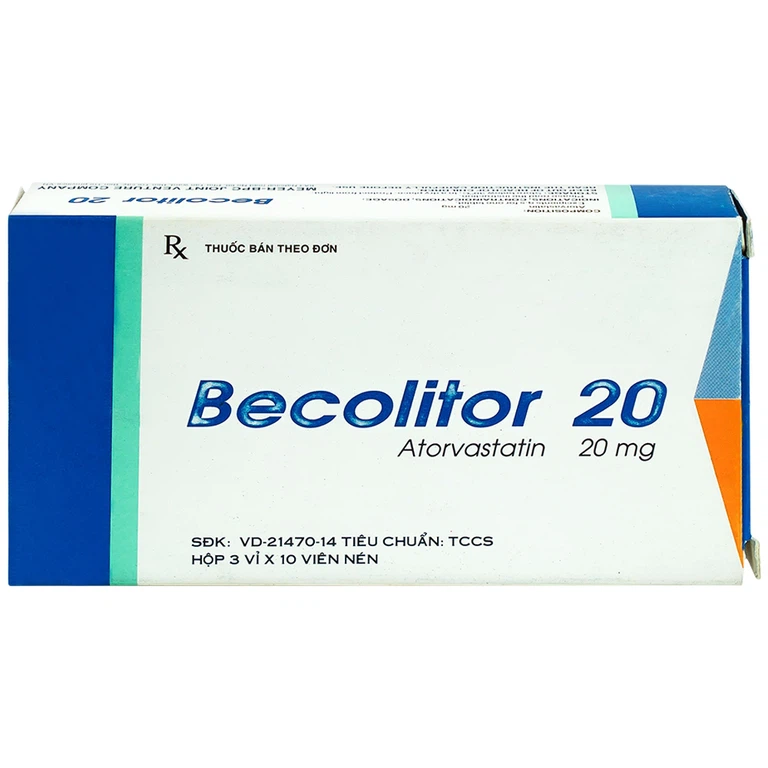 Thuốc Becolitor 20 do Công ty Liên doanh Meyer – BPC sản xuất, thuốc có chứa Atorvastatin (dưới dạng Atorvastatin calci trihydrat) 20mg. Thuốc Becolitor chỉ định điều trị các bệnh nhân bị tăng cholesterol toàn phần, LDL-cholesterol, apolipoprotein B và triglycerid và để làm tăng HDL-cholesterol ở các bệnh nhân có tăng cholesterol máu nguyên phát. Làm giảm cholesterol toàn phần và LDL-cholesterol ở các bệnh nhân có tăng cholesterol máu có tính gia đình đồng hợp từ khi chế độ ăn và các phương pháp không dùng thuốc khác không đáp ứng. Thuốc có quy cách đóng gói gồm hộp 3 vỉ x 10 viên nén.