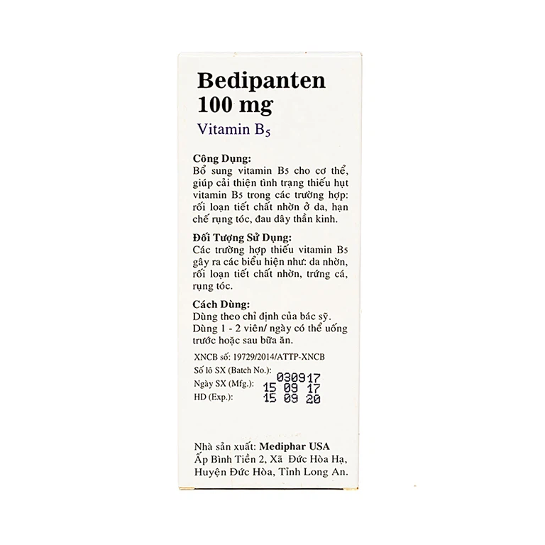 Viên uống Bedipanten 100mg bổ sung vitamin B5 cho cơ thể, giúp cải thiện tình trạng thiếu hụt vitamin B5 trong các trường hợp: rối loạn tiết chất nhờn ở da, hạn chế rụng tóc, đau dây thần kinh.