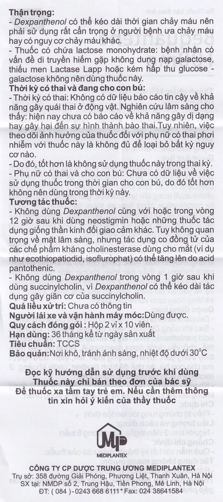 Sau khi uống Dexpanthenol dễ dàng chuyển hóa thành acid pantothenic, chất này phân bố rộng rãi trong mô cơ thể, chủ yếu dưới dạng coenzym A. Nồng độ cao nhất thấy trong gan, tuyến thượng thận, tim, thận. Sữa người mẹ cho con bú, ăn chế độ bình thường, chứa khoảng 2microgam acid pantothenic trong 1ml.
